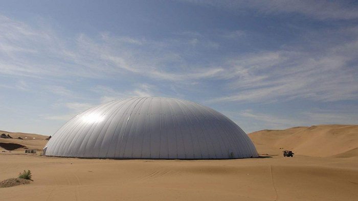 充氣膜結(jié)構(gòu)是一個(gè)相對密閉的空間結(jié)構(gòu),與傳統(tǒng)空間結(jié)構(gòu)建筑不一樣的是,它通過風(fēng)機(jī)向結(jié)構(gòu)內(nèi)部鼓風(fēng)送氣,使膜結(jié)構(gòu)內(nèi)外保持一定的壓力差,以保證膜結(jié)構(gòu)體系的剛度,維持所設(shè)計(jì)的形狀。